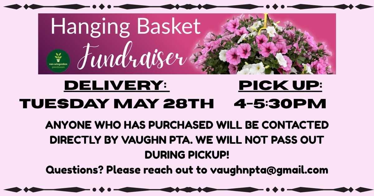 If you ordered a hanging basket from the 5th grade fundraiser, they will be availablefor pick up, Tuesday April 28th. See flyer below.